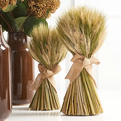 - Wheat Bundles: Wheat bundles are a great way to add a harvest-inspired touch to your front porch door. The best part is that the country dried wheat bundle can stand on its own, so you can simply place it right outside. Alternatively, pair the beautiful natural wheat bundle with an autumn-themed bucket or barrel to bring those harvest vibes to your doorstep.