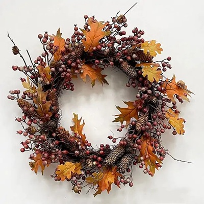 - Autumn Harvest Wreath: Your first option is to go for an autumn harvest wreath, which contains dried fruits, vegetables, and leaves that represent the fall harvest. You can stick with a classic, like the enchanting autumn berry wreath, a showstopper like the amber autumn faux floral wreath, or opt for something small like the persimmon pick set.