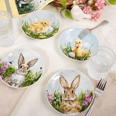 Seasonal dishware anchors the entire Easter table. For instance, a stoneware Easter plate set introduces its own subtle colors and patterns, but it’s still practical enough for serving meals. Stoneware is especially fitting when placed on a vintage-inspired table.