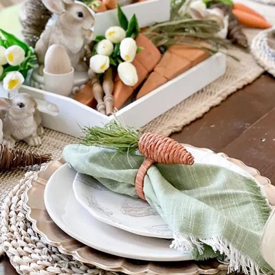 Napkin rings offer an easy way to add seasonal motifs to your dining table. A set of hammered metal bunny napkin rings adds shine and texture. Meanwhile, bunny ear burlap-wrapped rings feel more relaxed. Either option will add an extra flair to your motif.