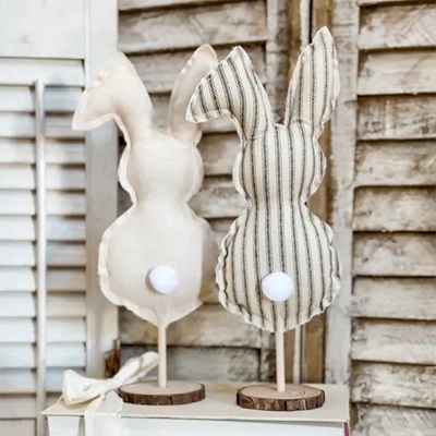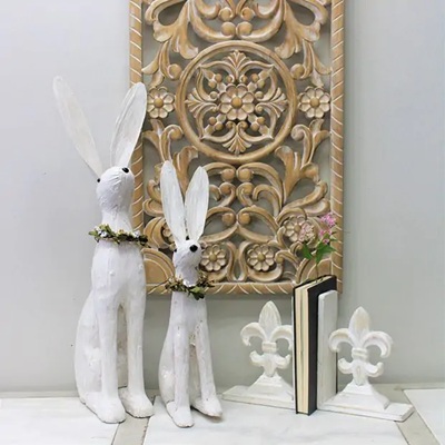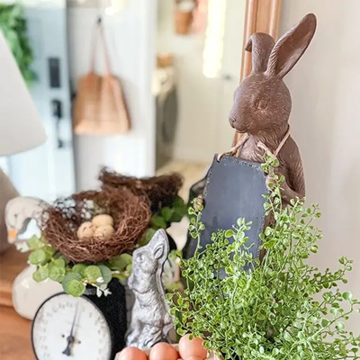 A simple centerpiece guides the overall look of your dining table. Something like a floppy-ear bunny tabletop accent makes a great focal point when it’s paired with greenery or candlesticks. These types of sculptural pieces add charm without dominating the entire surface.