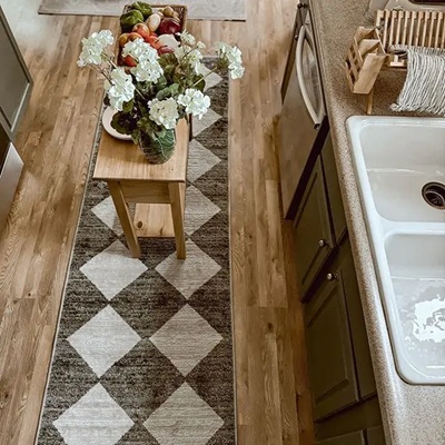 Though similar to the farmhouse style, the modern farmhouse decor style offers contemporary lines and rustic charm. It also seeks to create a high-contrast palate. Colors include black, white, and neutral tones of wood. To add an instant modern farmhouse splash, pick up a checked tile area rug.