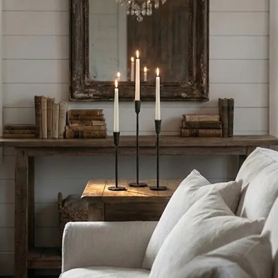 One way to add light to your living room is with our minimalist black iron taper holders. These hold actual candles, rather than electric ones. Make your candle holders into a subtle statement piece. Alternatively, enjoy their warm ambiance and understated elegance.