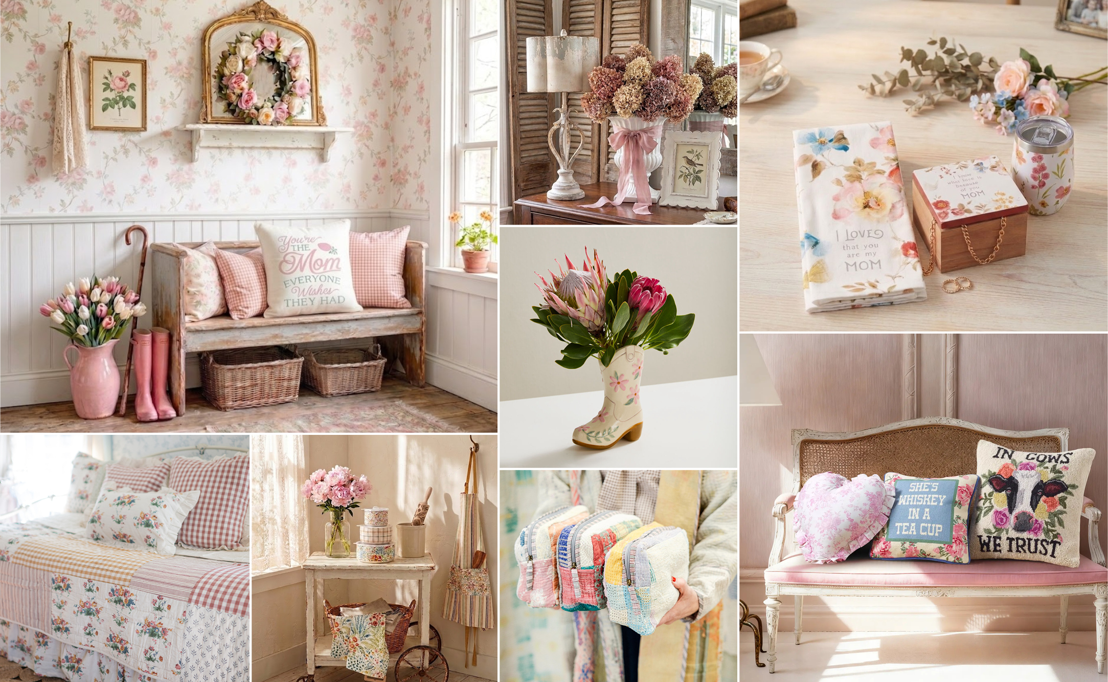 Let The Mom Everyone Wishes Floral Accent Pillow be a daily reminder to your mom of all the love and appreciation you have for her. Show your love to Mom with a vibrant bouquet of flowers showcased in our charming ceramic Cowgirl Boot Vase. Transform any bedroom into a cozy cottage retreat with our Gingham and Floral Patchwork 5 Piece Daybed Quilt Set. Our Because of You Mom Gift Set blends florals with thoughtful details, offering pieces she'll reach for often, and our Mother Who Likes To Cook Gift Set is practical, pretty, and brings together everything she needs to create, serve, and enjoy her time in the kitchen. For more gorgeous decorating ideas, DIY, and design inspiration, be sure to check out our friend @whitecottagecreek on Instagram.
