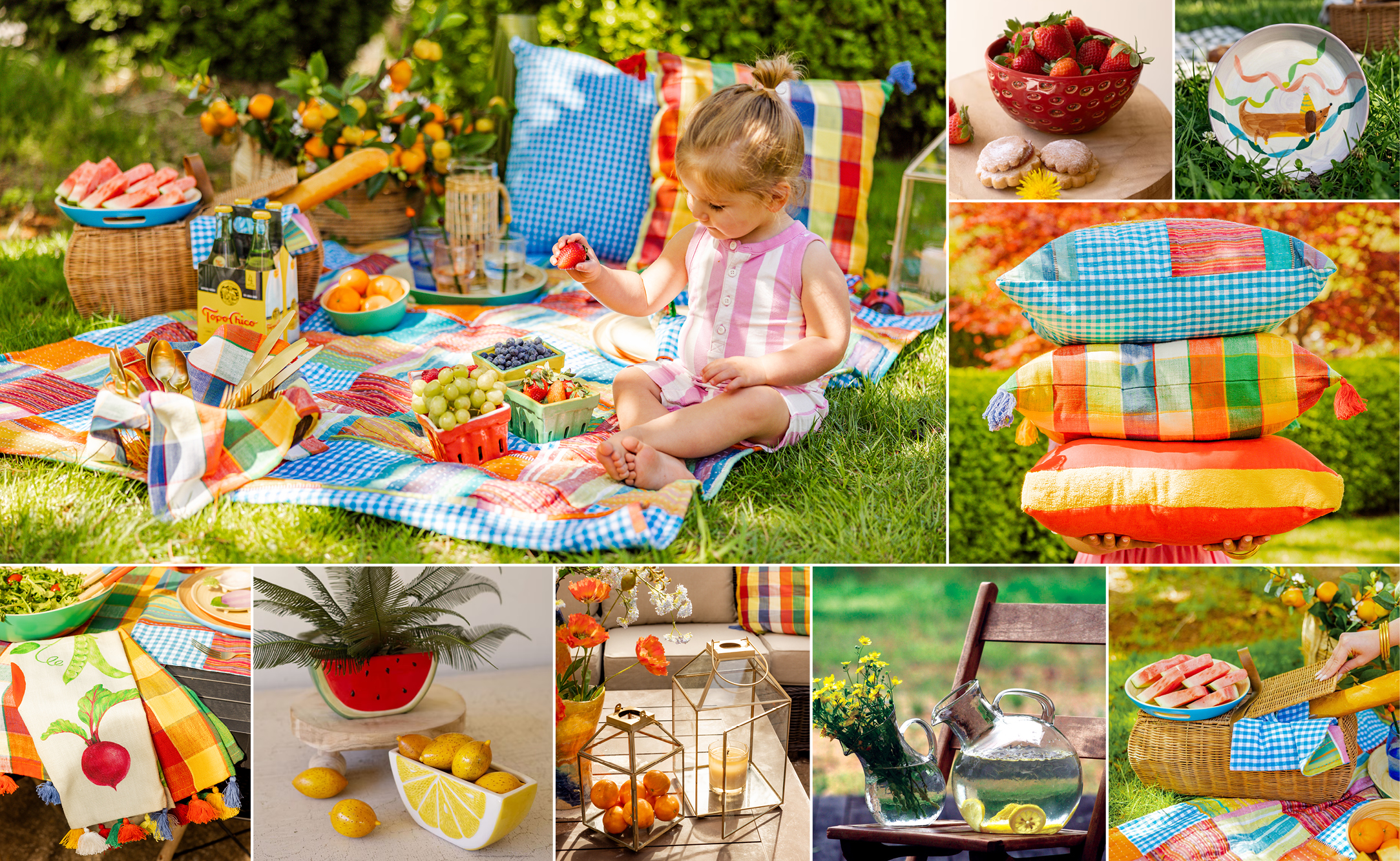 Step into the sweetness of the season with FROM THE PICNIC PATCH, where sun-drenched days and colorful gatherings come to life. Inspired by cheerful plaids, fresh-picked fruit, and easy afternoons spent outdoors, this collection captures the joy of a picnic spread in full color. From vibrant textiles to playful tabletop accents and charming details throughout, everything feels bright, inviting, and ready for a day well spent in the sunshine.