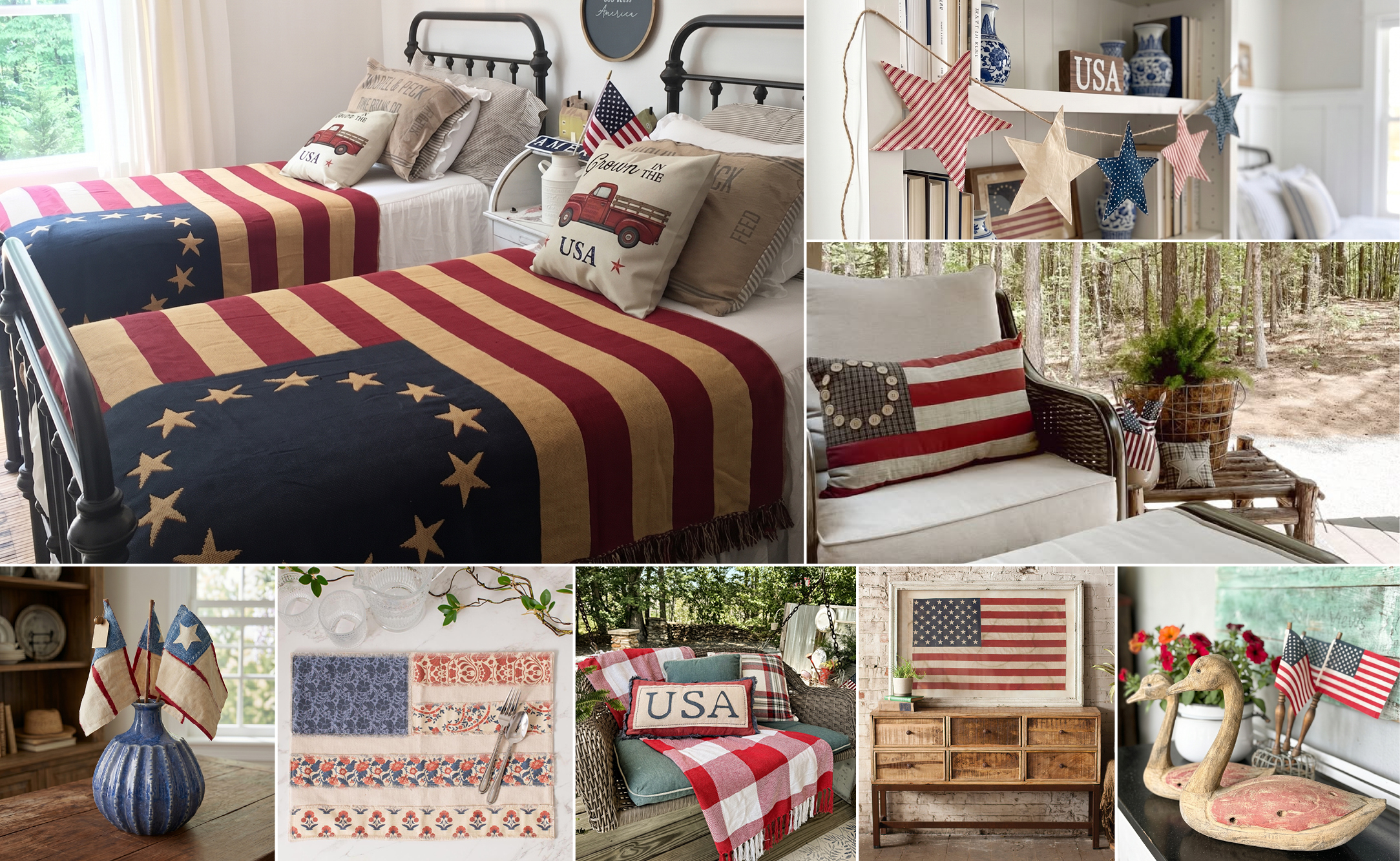 Add comfortable style and a symbol of greatness to your home with our Old Glory American Flag Throw Blanket. Bring a touch of rustic charm and patriotic spirit to any space with our USA Stonewashed Lumbar Pillow. You can add an inviting look and perfect dimension to any tabletop display with our Woodland Wood Duck Sculptures. Perfect for displaying as a standalone piece or showcasing fresh blooms, our Seaside Harbor Blue Ceramic Vase brings a breath of coastal charm to your home. Our Americana Patchwork Flag Placemats offer patriotic charm and a handcrafted feel to your table, while our Primitive Patriotic Fabric Star Banner Garland adds a festive sense of heritage and timeless Americana charm to your summer celebrations. For more gorgeous decorating ideas, DIY, and design inspiration, be sure to check out our friends @glendashulleetastudio, @shady_pines3interiors, and @thepondsfarmhouse on Instagram.