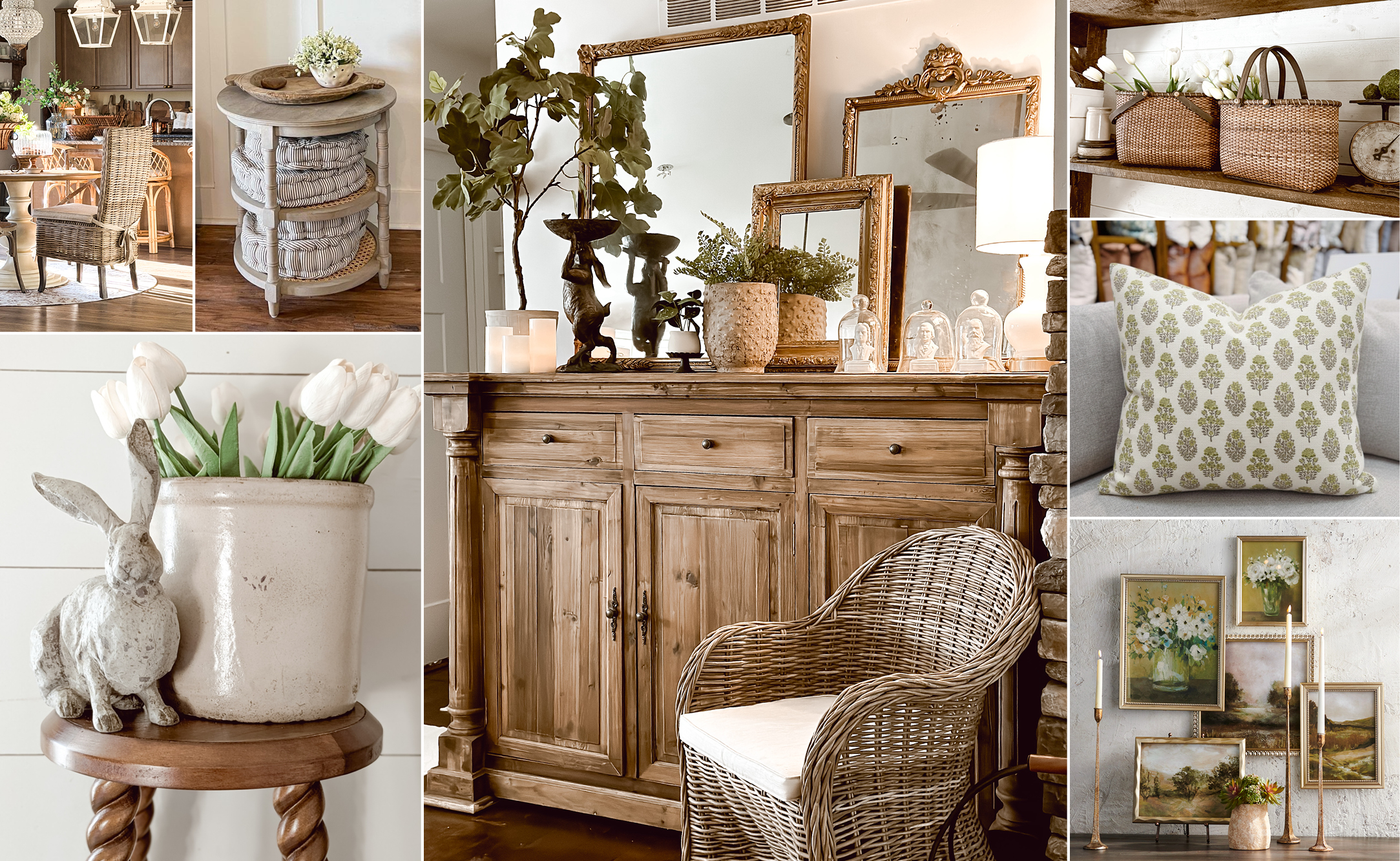 Add casual elegance to your dining room with our Cushioned Seat Rattan Dining Chair Set of 2. Bring a touch of shabby chic style to your bedroom, family room, or home office with our 3 Tier Round Side Table With Cane Shelves. Stand our Patina Finish Rabbit Bird Bath in your entryway filled with trailing greenery to enhance your decorating plan with a little rustic charm. Dress up your botanical displays or corral your clutter in a stylish way with our Double Handled Rattan Basket Set of 2. Our Tufted Round Floor Cushion is a simple but charming way to bring a bit of cozy charm to your living room, and our Long Ear Rabbit Statue Set of 2 is ready to hop right into your spring and Easter decor, whether placed in your living room, garden, or out on the patio. For more gorgeous decorating ideas, DIY, and design inspiration, be sure to check out our friends @downshilohroad, @livingitcountry, @rusticwildarrow, @our.cozy.little.home, and @krystlemarienickels on Instagram.